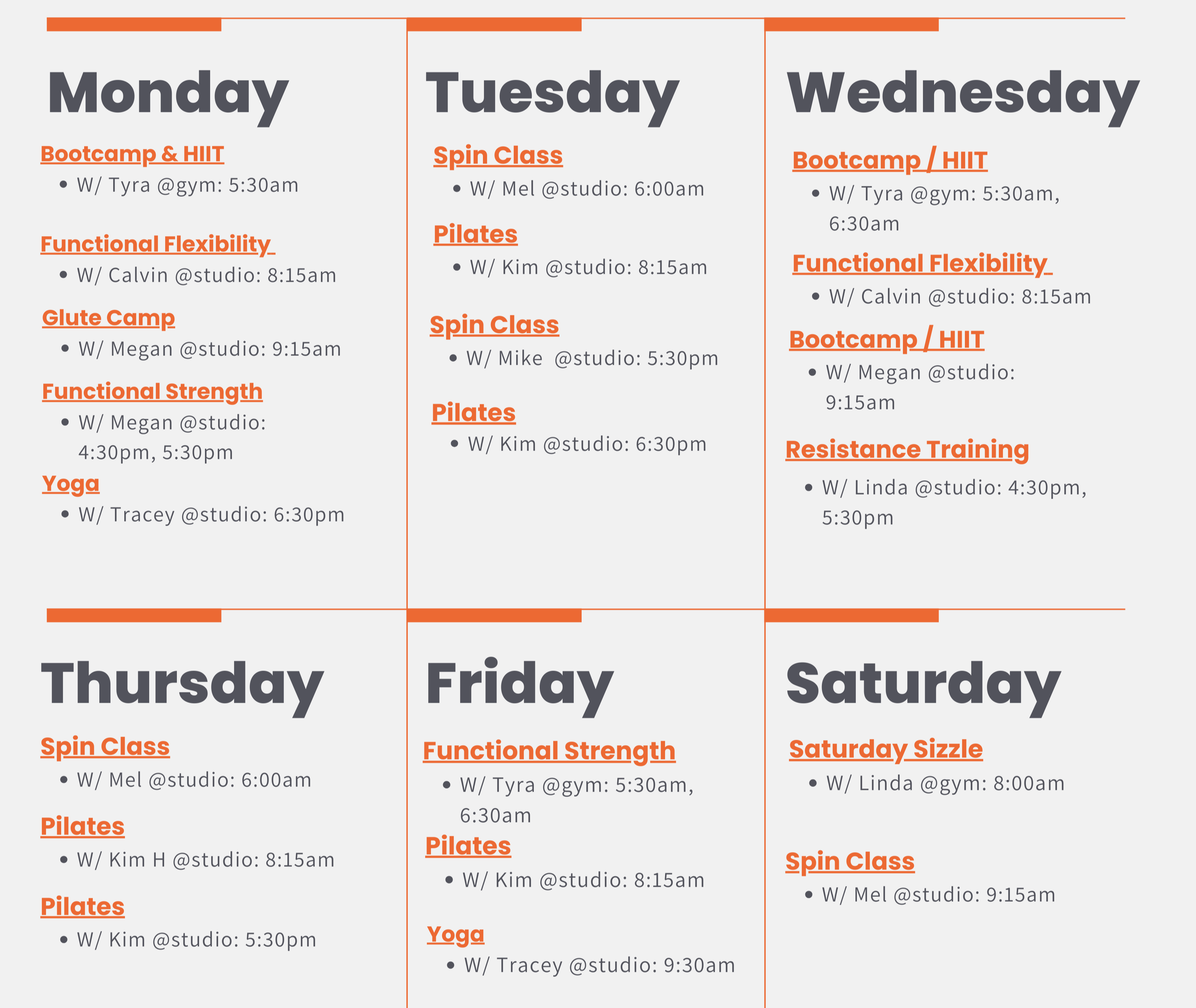 All classes are 45 minutes except for Pilates, Yoga, Saturday Sizzle, and Step & Sculpt class.